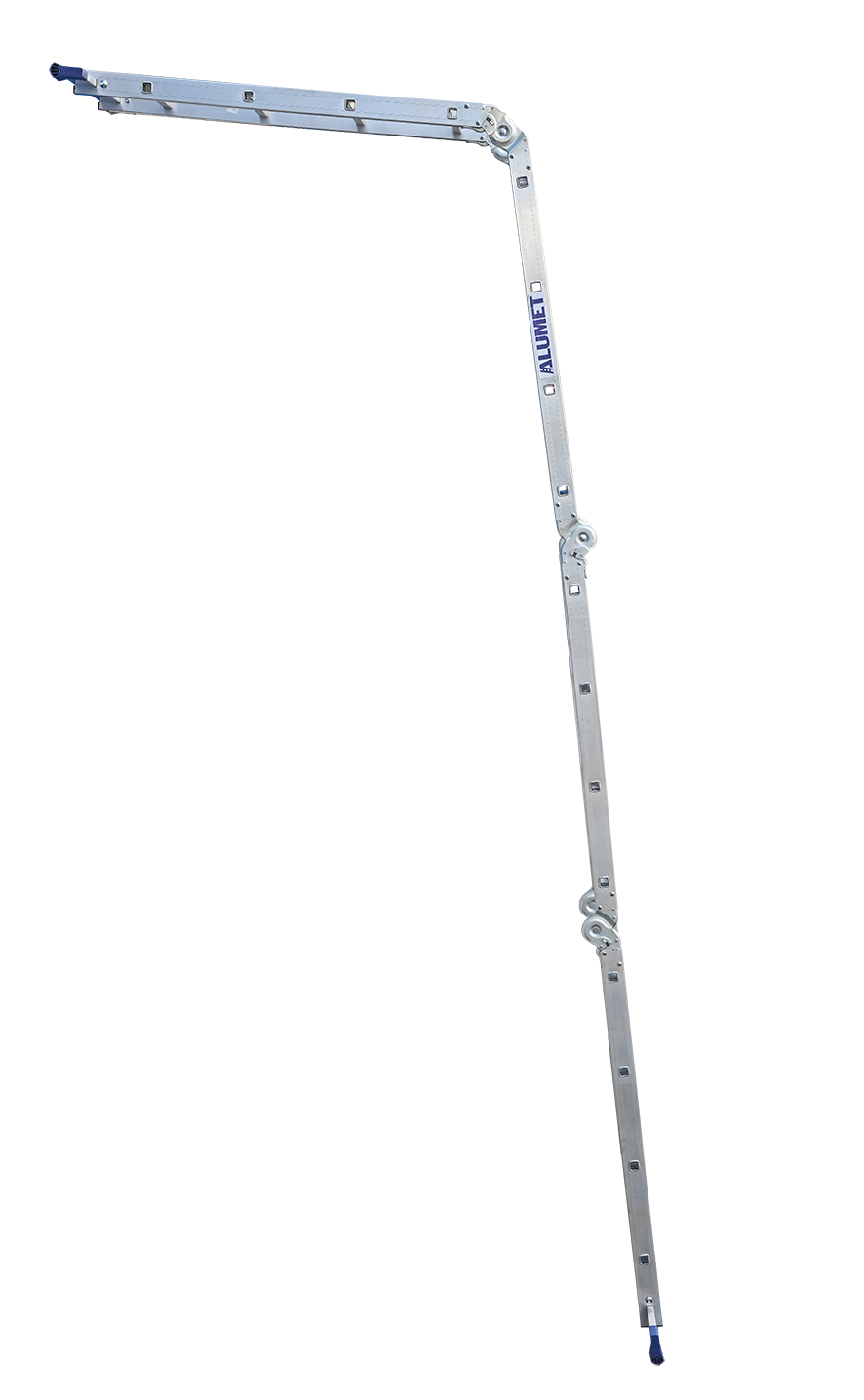 Лестница состоит из четырех секций, соединенных между собой стальными лестничными шарнирами с углами фиксации 35, 105 и 180 градусов. Поэтому такая лестница может принимать различные формы, такие как на рисунке.